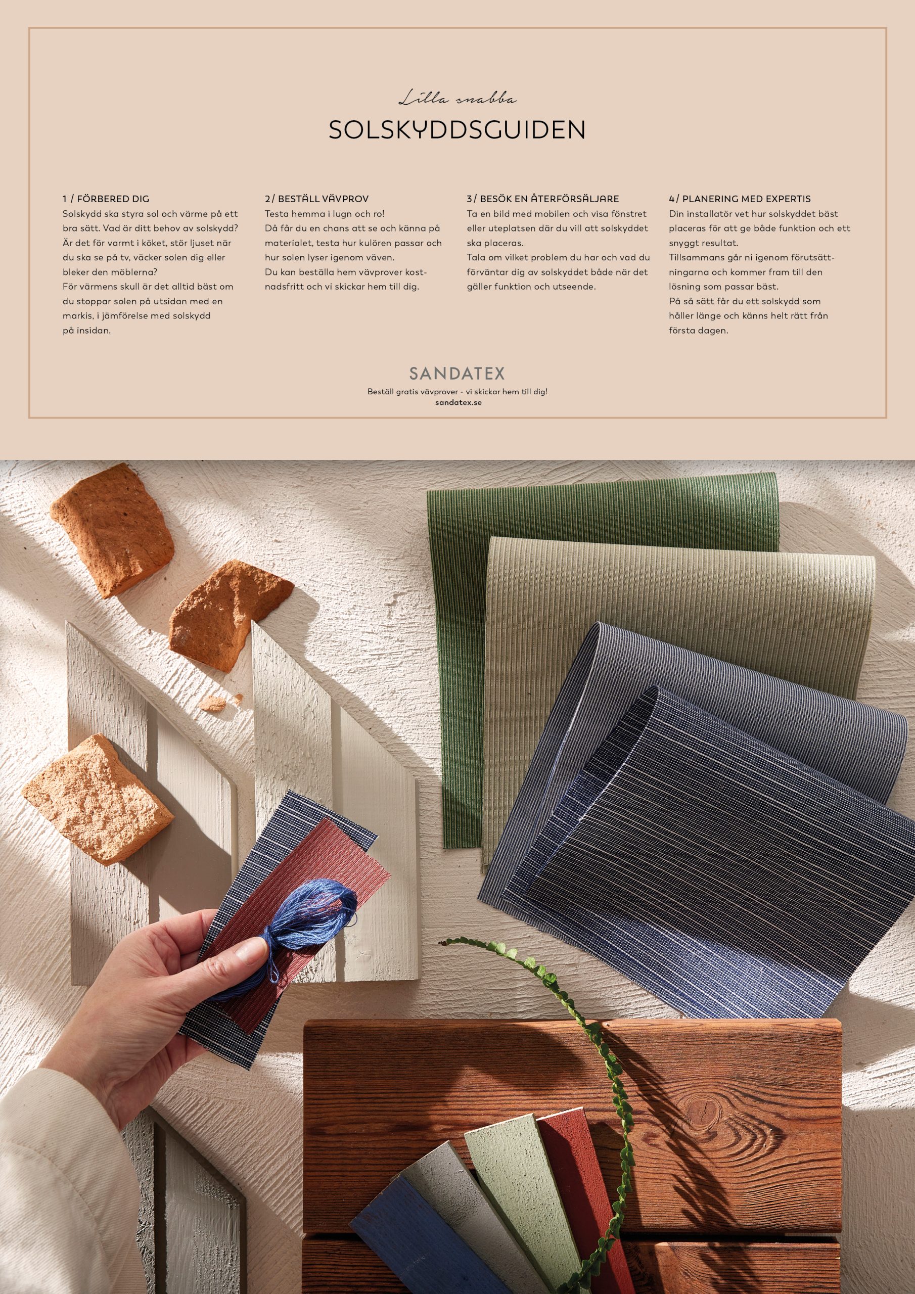 Nedan hittar du allt vårt inspirationsmaterial tillhörande våra aktuella kollektioner för invändiga och utvändiga solskydd.